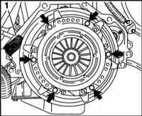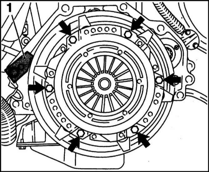 болты крепления корзины сцепления последовательно на 1 - 1 1/2 оборота