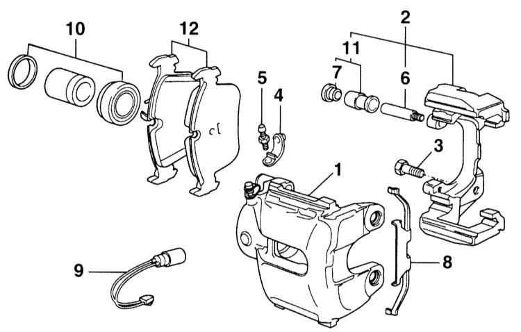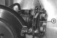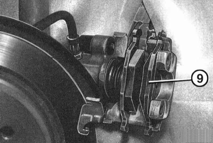 12 Вставьте в суппорт наружную колодку -9- и поставьте суппорт