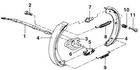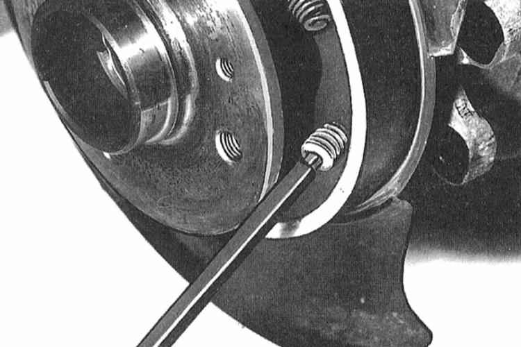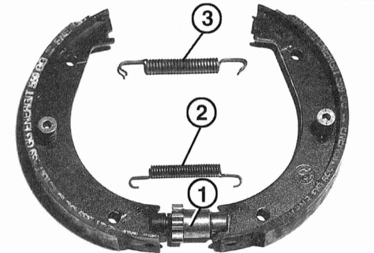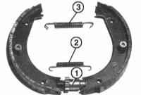Соедините возвратную пружину -2- (пружина меньшего диаметра) с тормозными колодками.