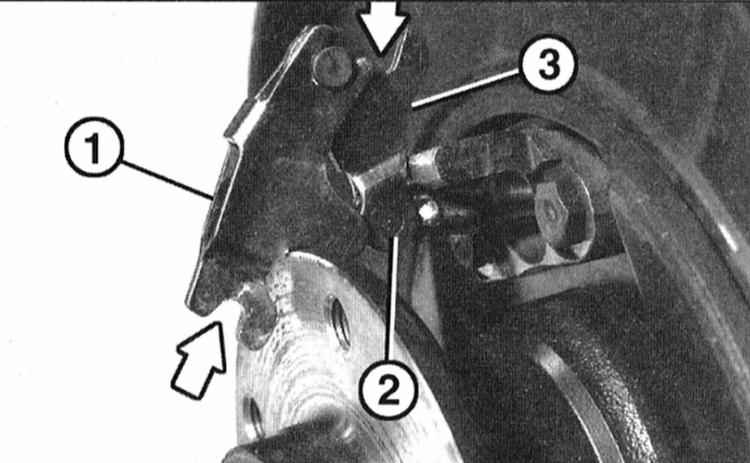 3 Проверьте движение механизма регулировки тормозных колодок -1-, слегка смажьте