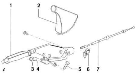 2 Соедините вверху замок с пальцем -2- с тросом привода тормоза. |