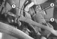 9 Отверните на несколько оборотов болт -1- и снимите поворотный рычаг -2- вниз с амортизационной стойки -3-.