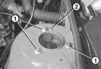 12 Отверните три гайки крепления -1- опоры амортизационной стойки.