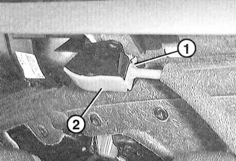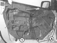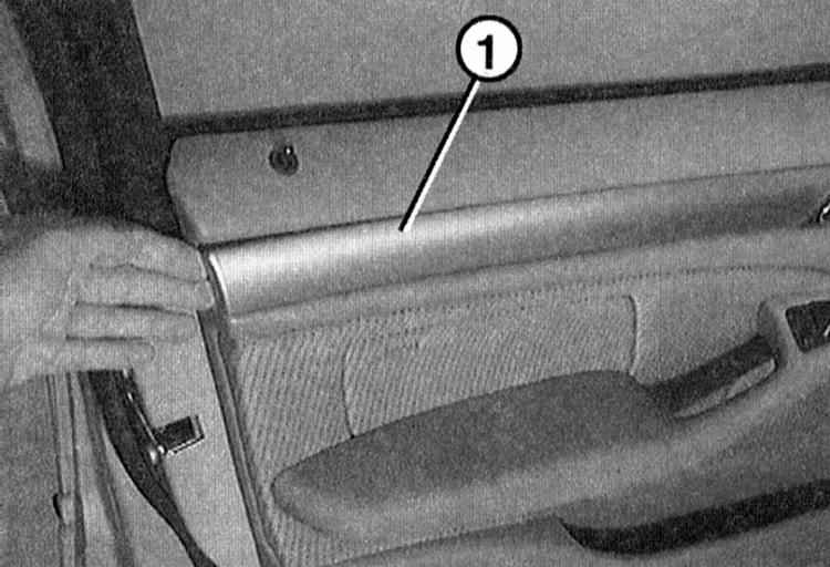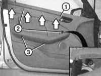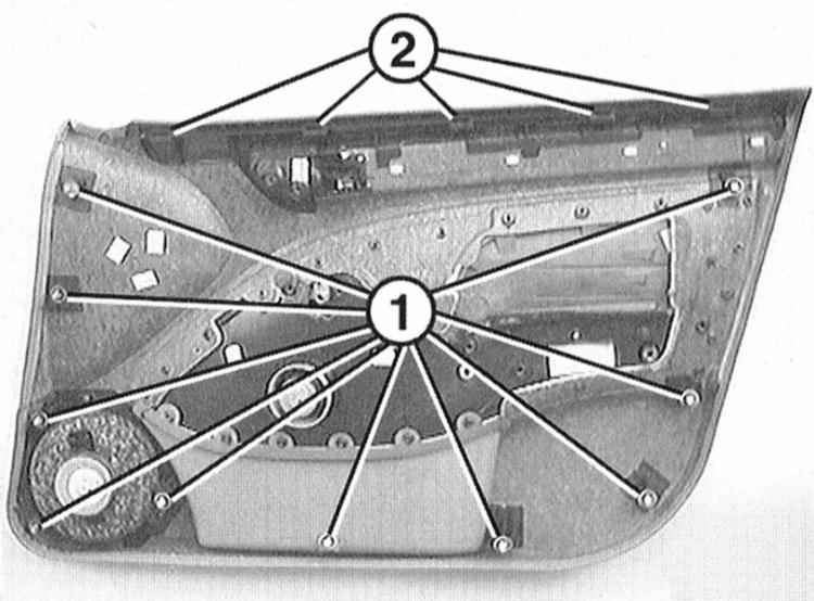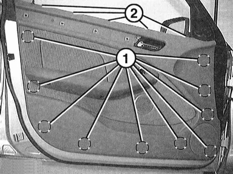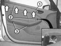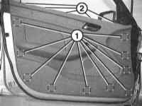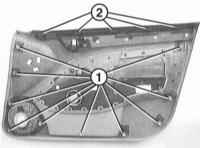 18 Проверьте надежность крепления зажимов -1- облицовки двери, при необходимости замените. 2 – опоры верхних скоб.