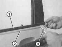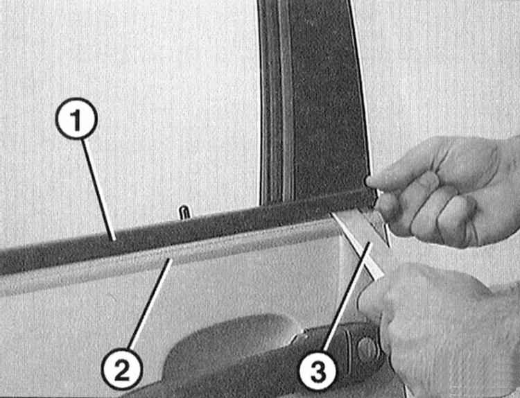 1 Снимите планку шахты стекла -1-. Для этого защитите клейкой лентой -2- лакокрасочное покрытие под планкой. Выдавите планку пластмассовым клином -3- вверх из шахты окна. При этом, как показано на иллюстрации, начинайте сзади. В передней части вытяните планку под зеркалом. |