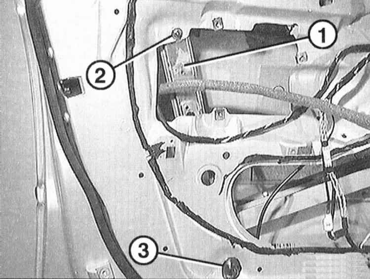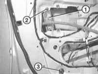 9 Отсоедините заднюю шину стеклоподъемника -1-. Для этого ослабьте крепление гаек -2- и -3-, не отворачивая их. Предварительно снимите герметик с гайки -3-.