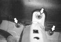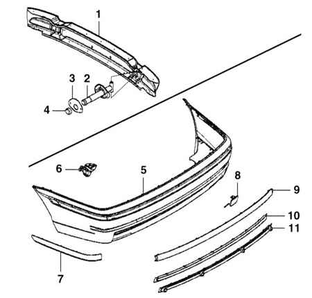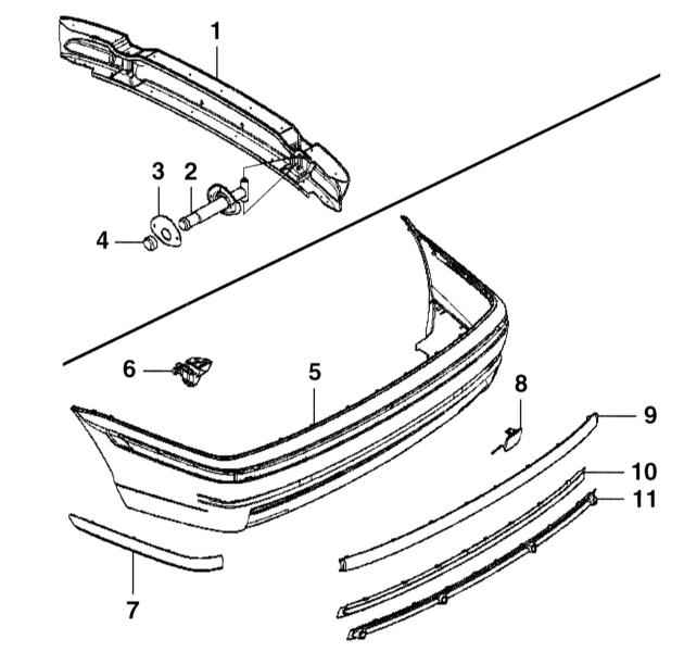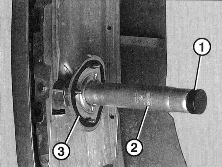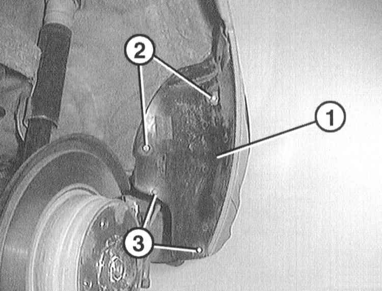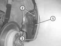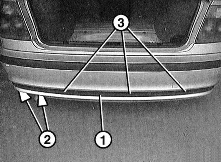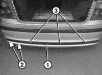 12.3.3. Снятие и установка заднего бампераЗадний бампер  | | 1 — балка бампера 2 — амортизатор 3 — уплотнительная прокладка 4 — крышка 5 — облицовка бампера 6 — опора боковой стенки левая | 7 — планка левая 8 — крышка отверстия для буксировки 9 — планка центральная 10 — козырек нижний 11 — козырек нижний, для моделей с предупреждением об опасном сближении при парковке (PDC) | Передний бампер выполнен таким образом, что он выдерживает без повреждений лобовое столкновение при скорости 4 км/час. При этом энергия удара воспринимается через находящуюся внутри алюминиевую балку и два гидравлических амортизатора. | |  | 1 Снимите слева и справа задние козырьки арок колес -1-. Для этого выверните два болта -2-. Выньте отверткой штифты -3-, затем снимите зажимы. После этого выньте козырьки сбоку у бампера. | 2 Откройте багажник и снимите левую боковую облицовку, обратитесь к Разделу Снятие и установка облицовки задней панели. 3 Модели 316i, 318i: Снимите правую боковую облицовку и выньте правый карман, обратитесь к Разделу Снятие и установка облицовки задней панели. 4 Модели 320d, 320i, 323i, 328i: Снимите крышку аккумуляторной батареи, обратитесь к Разделу и установка аккумуляторной батареи.  | 5 Отверните три гайки крепления бампера слева и справа ключом на 13 мм. Предварительно снимите крышку верхней гайки. |  | 6 У автомобилей с системой предупреждения об опасном сближении при парковке снимите крышку -1-. При этом сначала снизу отсоедините стопорные лапки, а затем потяните назад оставшуюся часть козырька и отсоедините ее в точках -3-. Расстыкуйте штекерные соединения ультразвуковых преобразователей и снимите козырек. Отсоедините слева внизу держатель кабеля. | 7 Выньте бампер с помощью ассистента. | | | | | 8 Если необходимо, скомплектуйте бампер. |  | 9 Если необходимо, наденьте на амортизатор -2- пластмассовую крышку -1- и уплотнение -3-. Крышка при снятии часто остается в опоре амортизатора. | 10 Вставьте бампер с помощью ассистента в боковые направляющие и сместите вперед, прижмите сбоку переднюю часть и сместите вперед до упора. 11 У автомобилей с системой предупреждения об опасном сближении при парковке закрепите слева снизу держатель кабеля. Состыкуйте штекерные соединения ультразвуковых преобразователей и закрепите козырек. 12 Немного приподнимите бампер сзади, выставьте его параллельно кузову и закрепите моментом 20 Н•м. Расстояние между бампером и кузовом должно составлять 5 ± 1 мм. 13 Высота бампера регулируется при снятом амортизаторе путем вращения пластмассовой вставки с внутренним шестигранником в амортизаторах. 14 Установите на место крышки верхних гаек крепления. 15 Вставьте задние козырьки арок колес слева и справа и закрепите их. Вставьте две заклепки и вдавите до упора штифты. 16 Модели 320d, 320i, 323i, 328i: Установите на место крышку аккумуляторной батареи, обратитесь к Разделу и установка облицовки задней панели. 17 Модели 316i, 318i: Установите правую боковую облицовку и правый карман, обратитесь к Разделу Снятие и установка облицовки задней панели. 18 Установите левую боковую облицовку, обратитесь к Разделу Снятие и установка облицовки задней панели. | |
