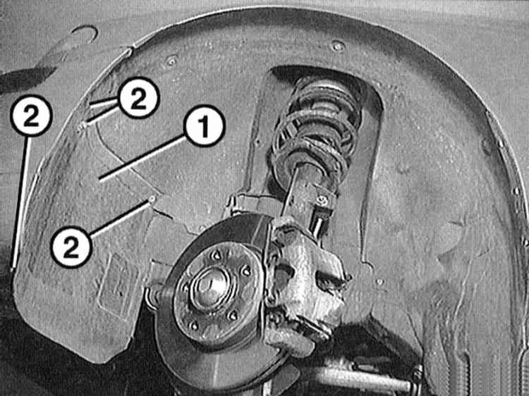 1 Отверните болты крепления -2- козырька арки колеса -1-.