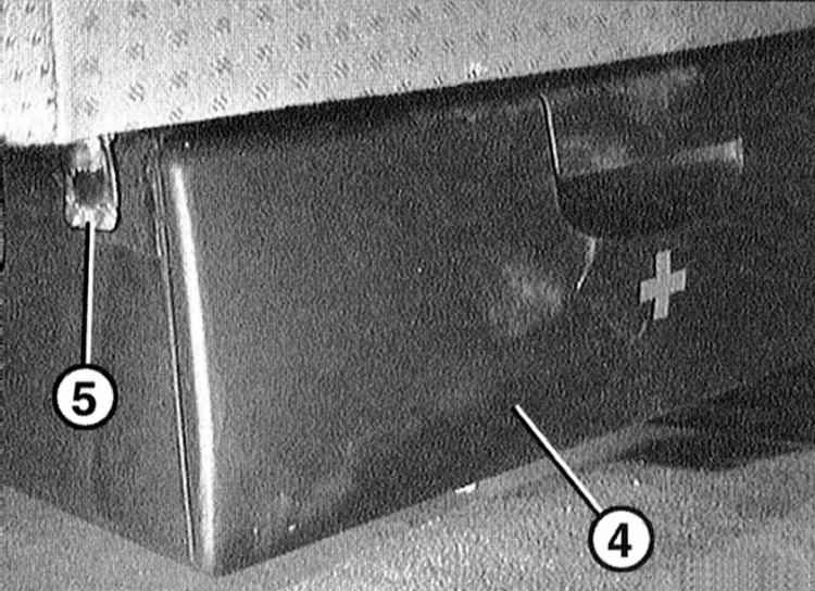 15 Сиденье переднего пассажира: Вставьте аптечку первой помощи задними цапфами в направляющие на сиденье, надавите спереди вверх и зафиксируйте в скобах.
