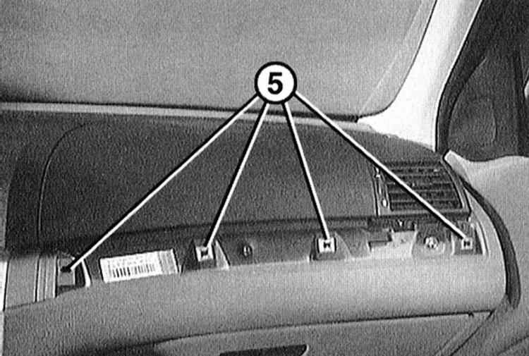 Снимите левый передний козырек -1- с панели приборов. Для его снятия можно