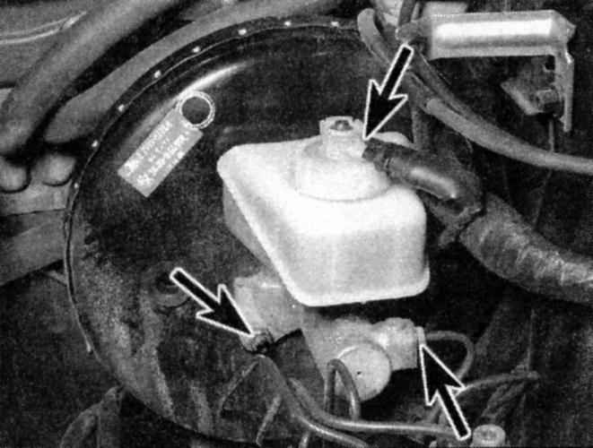 - Главный цилиндр соединен с вакуумным усилителем тормозной системы, и оба они крепятся на переборке в левой части двигательного отсека. Чтобы снять главный цилиндр, отсоедините электрический разъем (верхняя стрелка), штуцера гидравлической тормозной линии (нижняя правая стрелка, другой штуцер не виден на этом фото) и отдайте две гайки крепления главного цилиндра (нижняя левая стрелка, другая гайка не видна на этом фото).