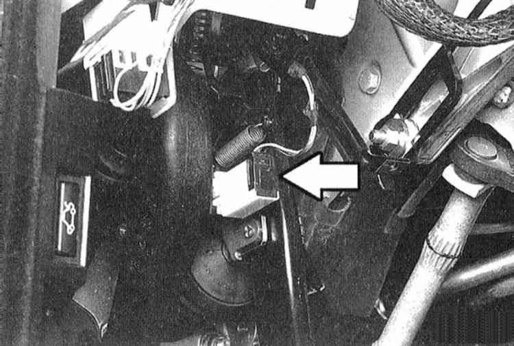 3 Проверьте выключатель стоп-сигнала. Для этого снимите крышку над педалью тормоза. Расстыкуйте разъем выключателя.
