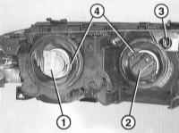 1 Расстыкуйте разъем на патроне поврежденной лампы. Поверните против часовой стрелки до упора крепежное кольцо -4- на патроне лампы ближнего света -1- или дальнего света -2- и выньте его.