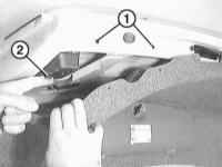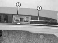 32 Снятие держателя лампы в крышке багажника: Снимите отверткой 2 фиксатора облицовки крышки багажника в точке -1-. Освободите скобу -2- на держателе лампы. Снимите держатель лампы и расстыкуйте разъем. |