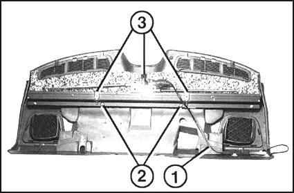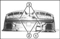 2. Освободите электрические провода (1). Обратитесь к сопроводительной иллюстрации. 3. Отверните гайки (2). 4. Отсоедините зажимы (3).