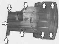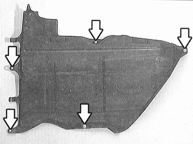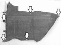 | 1 Поднимите и установите автомобиль на подставки.  | 2 Модели 320d: Снимите задний нижний щиток под КПП. Для этого поверните отверткой на 1/4 оборота (стрелки на иллюстрации) зажимы и снимите нижний щиток. |  | 3 Отверните болты крепления передней крышки (стрелки на иллюстрации), опустите ее и выньте переднюю кромку из бампера. | |