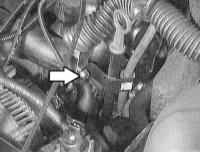 10 Отсоедините шланг охлаждающей жидкости у нижней части впускного трубопровода, для чего ослабьте хомут (стрелка на иллюстрации). |