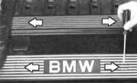 10 Снимите крышку горловины заливки масла. Подденьте отверткой небольшие крышки (стрелки на иллюстрации) и снимите. Ослабьте болты, лежащие под ними. Снимите 2 пластмассовые облицовки. |