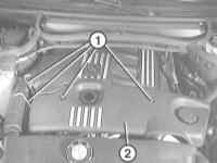 3 Отверните болты крепления -1- и снимите облицовку двигателя -2-. |