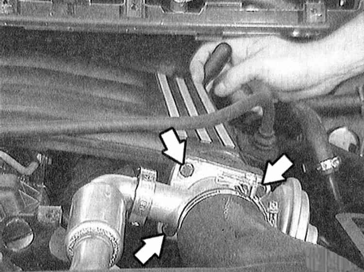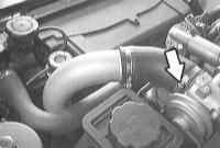 4 Снимите воздушный шланг между фильтрующей коробкой воздуха и патрубком дроссельной заслонки, для чего ослабьте крепление хомута.