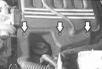 18 Отверните болты крепления и снимите впускной трубопровод с головки цилиндров (стрелки на иллюстрации). Внимание: Следите за тем, чтобы во впускные полости не попали какие-либо детали. |