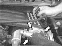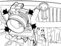 9 Отверните болты крепления (стрелки на иллюстрации) и снимите патрубок дроссельной заслонки вместе с уплотнением. |