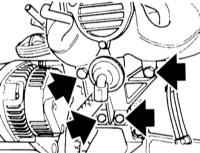8 Отверните болты крепления (стрелки на иллюстрации) и снимите крышку слева у двигателя.
