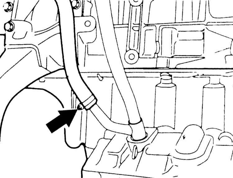 7 Отсоедините шланг слива масла у направляющей трубы указателя уровня масла, предварительно ослабив крепление хомута. |