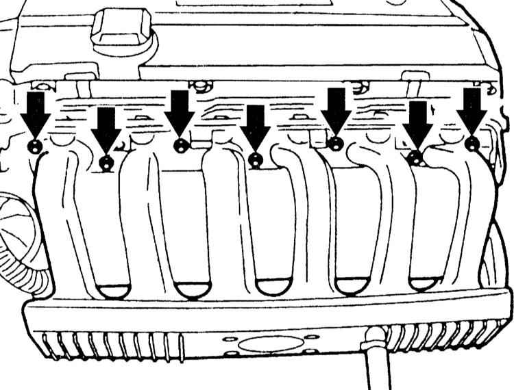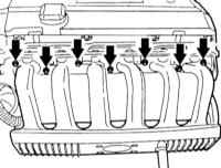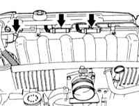 5 Отверните болты крепления верхней части впускного трубопровода у передней опоры, а также у задней опоры (стрелки на иллюстрации). |