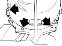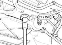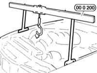 3.2.2. Снятие и установка поддона картера | |  | Вследствие ограниченной площади для снятия поддона картера необходимо отсоединить обе опоры двигателя и опустить балку передней подвески. | 1 Снимите воздухосборную коробку отопителя, обратитесь к Разделу и установка коробки воздухозаборника. 2 Снимите шланг всасываемого воздуха с воздухосборной коробки, обратитесь к Разделу и установка воздушного фильтра двигателя. 3 Модели 320d: Снимите крышку двигателя в районе масляного фильтра, обратитесь к Разделу Соединение и разъединение быстроразъемной муфты.  | Операция подъема и установки автомобиля на подставки связана с опасностью! Поэтому перед проведением операции ознакомьтесь с Разделом и буксировка | 4 Поднимите и установите автомобиль на подставки. Отверните болты крепления и снимите крышку двигательного отсека, обратитесь к Разделу и установка нижней крышки двигательного отсека. 5 Слейте двигательное масло, обратитесь к Разделу двигательного масла и масляного фильтра.  | 6 Модели 320i, 323i, 328i: Снимите шланг слива масла с отделителя масла на направляющей трубе указателя уровня масла. Для этого отсоедините хомут крепления (стрелка на иллюстрации). | 7 Отверните направляющую трубу указателя уровня у держателя. Выньте направляющую трубу вверх из поддона картера. При этом обратите внимание на уплотнительное кольцо. 8 Модели 320i, 323i, 328i: Отверните болты крепления насоса гидроусилителя руля и подвесьте на проволоке с присоединенными шлангами к двигателю, обратитесь к Разделу Снятие и установка насоса гидроусилителя  | Шланги следует оставить присоединенными к насосу, в противном случае будет вытекать масло. Если гидросистема вскрывается, необходимо следить за особой чистотой, так как попавшая в систему грязь может привести к отказам. |  | 9 Приподнимите двигатель краном за передние проушины. Если крана в наличии нет, проденьте трос через проушины на двигателе. Проденьте через трос трубу достаточной прочности и обоприте ее на две подставки.  | Приспособление BMW-00 0 200, показанное на иллюстрации, опирается слева и справа на опоры крыльев и крепится там болтами. В продаже имеется подобное приспособление KLANN № KL-0205-3US. | | 10 Приподнимите двигатель краном на 5 мм, чтобы разгрузить опоры. 11 Модели 320i, 323i, 328i: Ослабьте опоры двигателя справа и слева вверху примерно на 4 оборота. 12 Отверните с нижней стороны автомобиля гайки от обеих опор двигателя.  | 13 Отсоедините рулевой вал от рулевого механизма и снимите нижнюю рулевую колонку от карданного шарнира (стрелки на иллюстрации). |  | 14 Отсоедините стабилизатор слева и справа от балки двигателя. Следующие операции более подробно описываются в Разделе и установка балки передней подвески  | Рулевой механизм снимать с балки передней оси не требуется. - Снимите усилитель передней части автомобиля. - Отверните болты крепления и снимите левый и правый поперечный рычаги подвески. - Подоприте балку передней подвески гаражным подъемником и подведите соответствующую опору. На иллюстрации показана опора BMW-31 2 220. Если указанной опоры в наличии нет, подложите деревянную прокладку, чтобы не повредить балку. - Отверните болты крепления балки и опустите ее возможно ниже. | | 15 Расстыкуйте разъем датчика уровня масла. 16 Модели 320d: Снимите с держателей на поддоне картера кабель датчика уровня масла и выключатель заднего хода