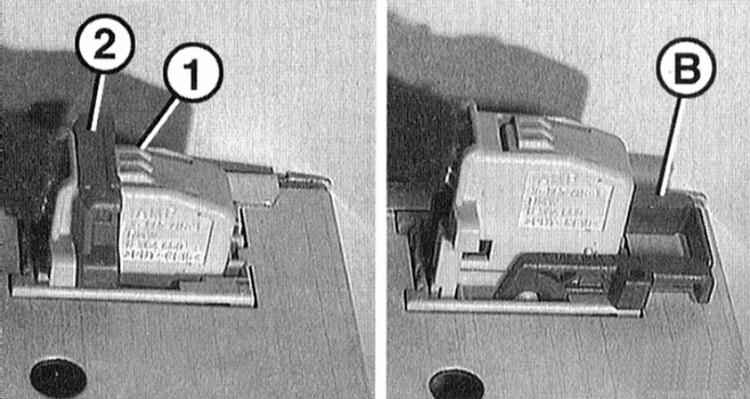 3 С обратной стороны расстыкуйте все штекерные соединения. Для этого вдавите лапку -1- и поверните скобу -2- на угол 90° -В-. Таким образом, штекер вынимается из направляющей.