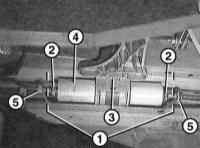 2 Подставьте под топливный фильтр соответствующую емкость -4-, чтобы собрать вытекающее топливо. Топливный фильтр находится на высоте балки РКПП на днище автомобиля. |