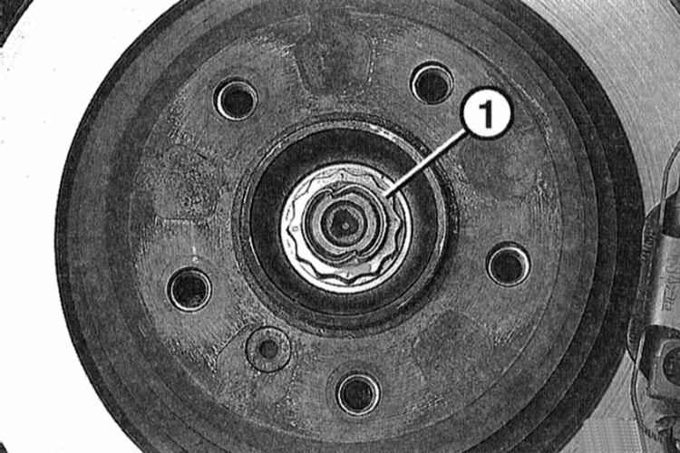 9 Затяните гайку с буртиком моментом 250 Н•м. Чтобы при этом зафиксировать колесо, попросите ассистента нажать на педаль тормоза.