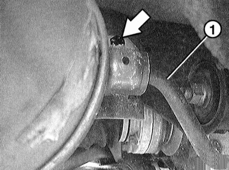 4 Отсоедините стабилизатор поперечной устойчивости -1- от балки задней подвески (стрелка на иллюстрации) и отведите вниз. Указание: На иллюстрации показано только левое крепление. |