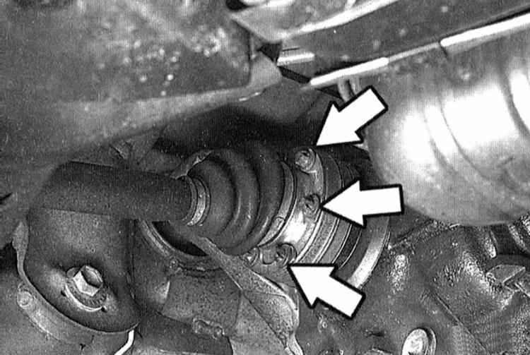 Приводные валы имеют различную длину. Слева располагается более короткий приводной вал, справа более длинный. Если снимаются оба приводных вала, их перед снятием необходимо маркировать.