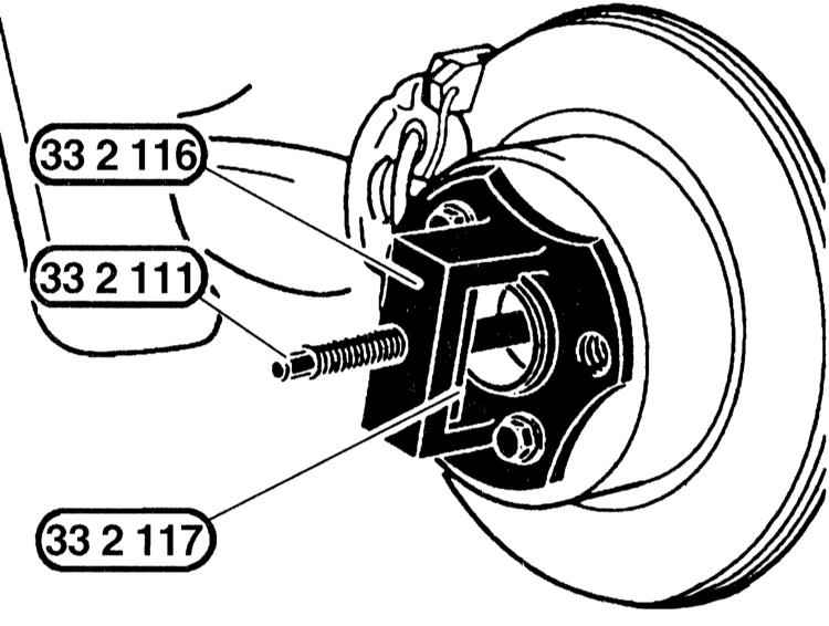 7 Для этого необходим соответствующий или инструмент BMW, обратитесь к иллюстрации. Съемник 332116 крепится двумя болтами крепления колеса, а винт 33211 вворачивается в приводной вал путем вворачивания в резьбовой элемент 332117. Вследствие этого приводной вал выдавливается.